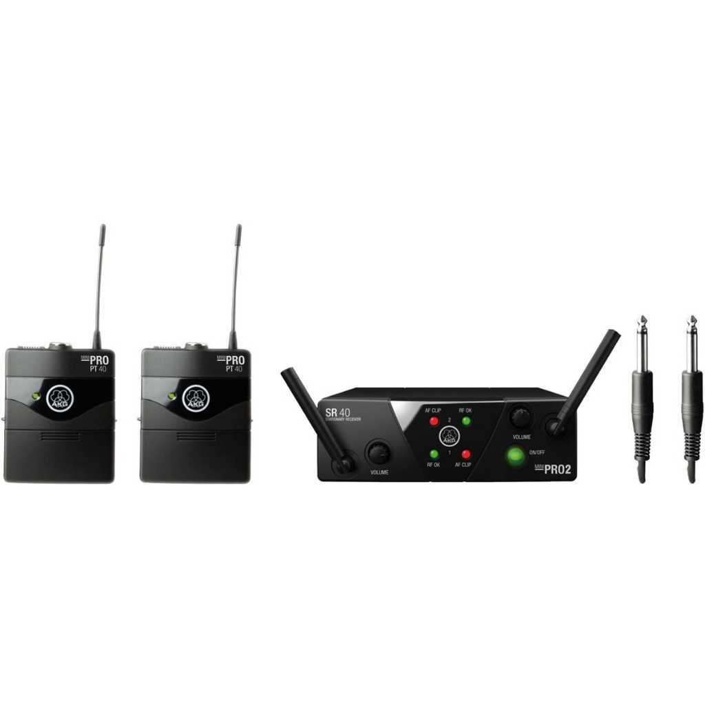 The AKG WMS40 Mini Dual Instrumental Set Wireless Microphone System - Band US25-A-C is the perfect solution for musicians seeking a reliable and high-quality audio experience. This plug-and-play wireless system delivers crystal clear sound, enabling performers to focus on their art without the hassle of cables. Each of the two included PT40 Mini pocket transmitters features a professional 3-pin mini XLR connector, ensuring compatibility with all guitars, basses, and AKG's MicroMics, from line to mic level.
