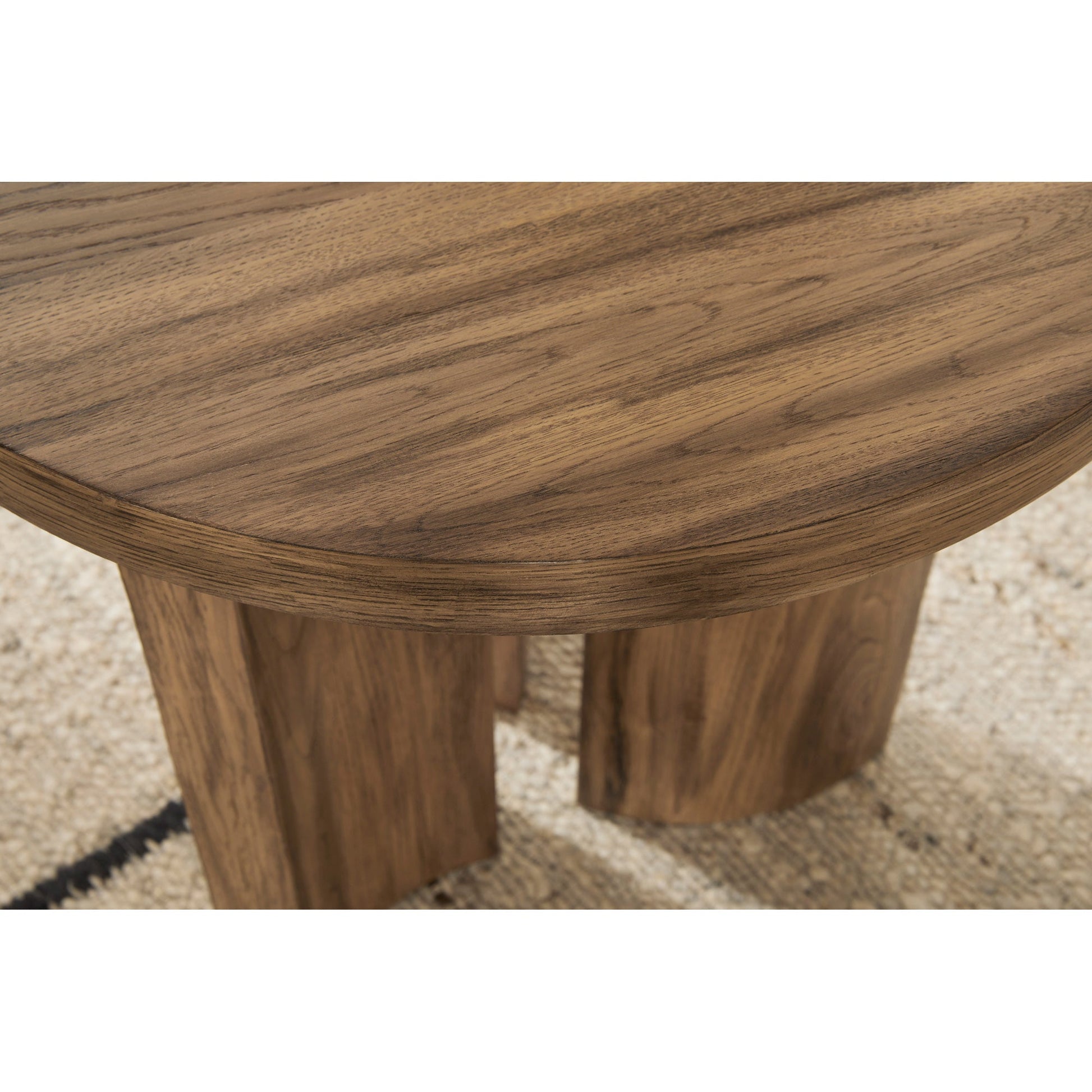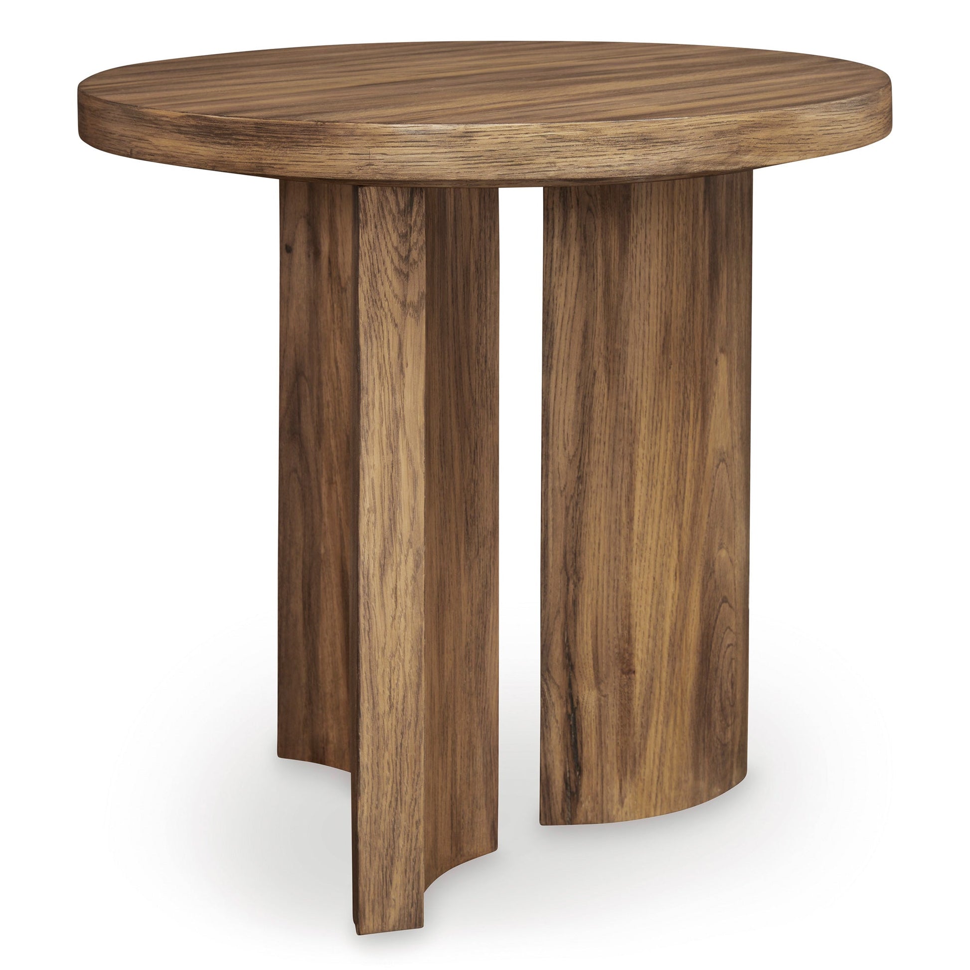 Showcasing an elevated, artistic silhouette, this end table expertly blends modern form and function. Its warm brown finish highlights the stunning wood grain, bringing an earthy element to staging a sofa-side lamp or other decor. Complete with a thick, substantial top, it's a naturally beautiful living room staple in the making. - Product Details provided by Manufacturer, Slumberland not responsible for errors in information.