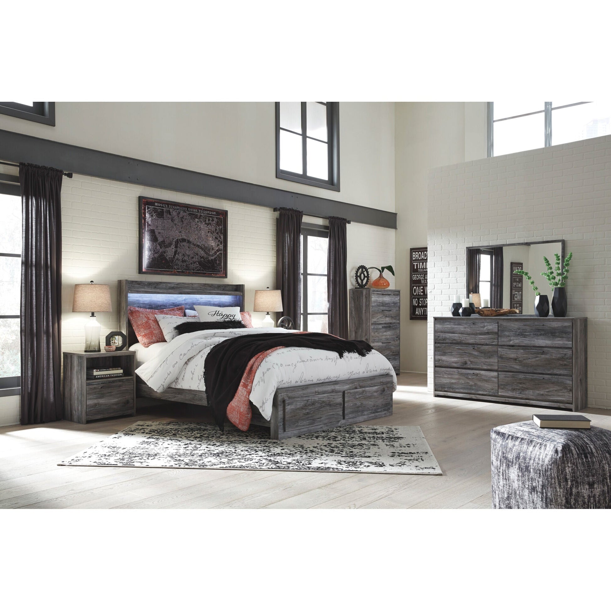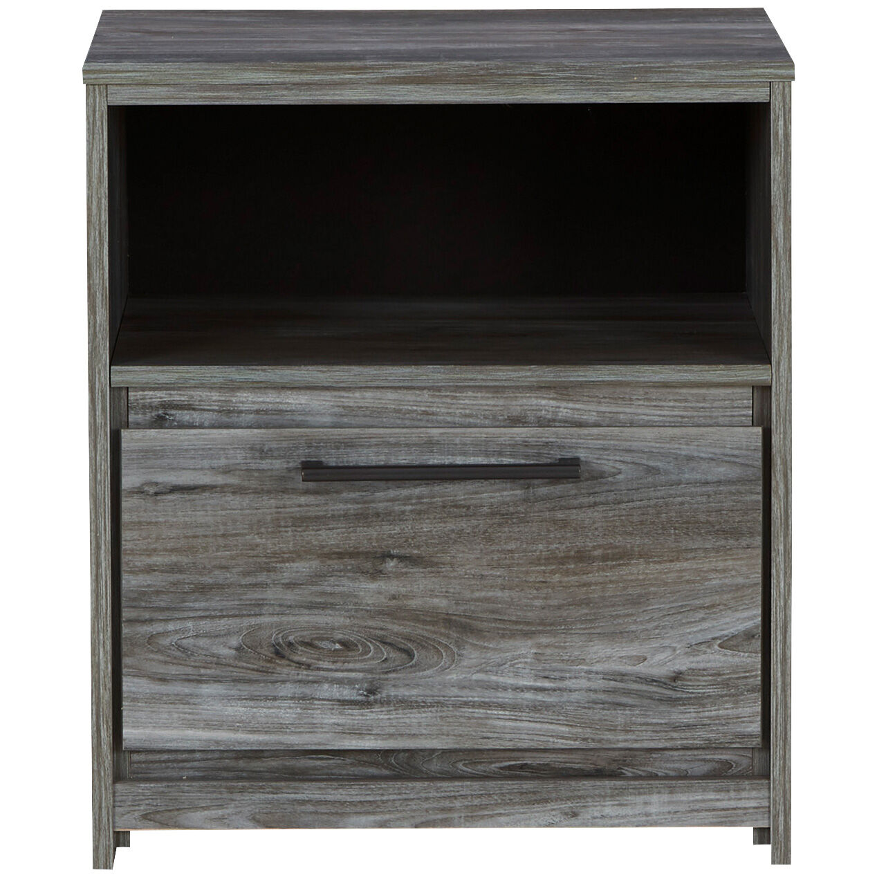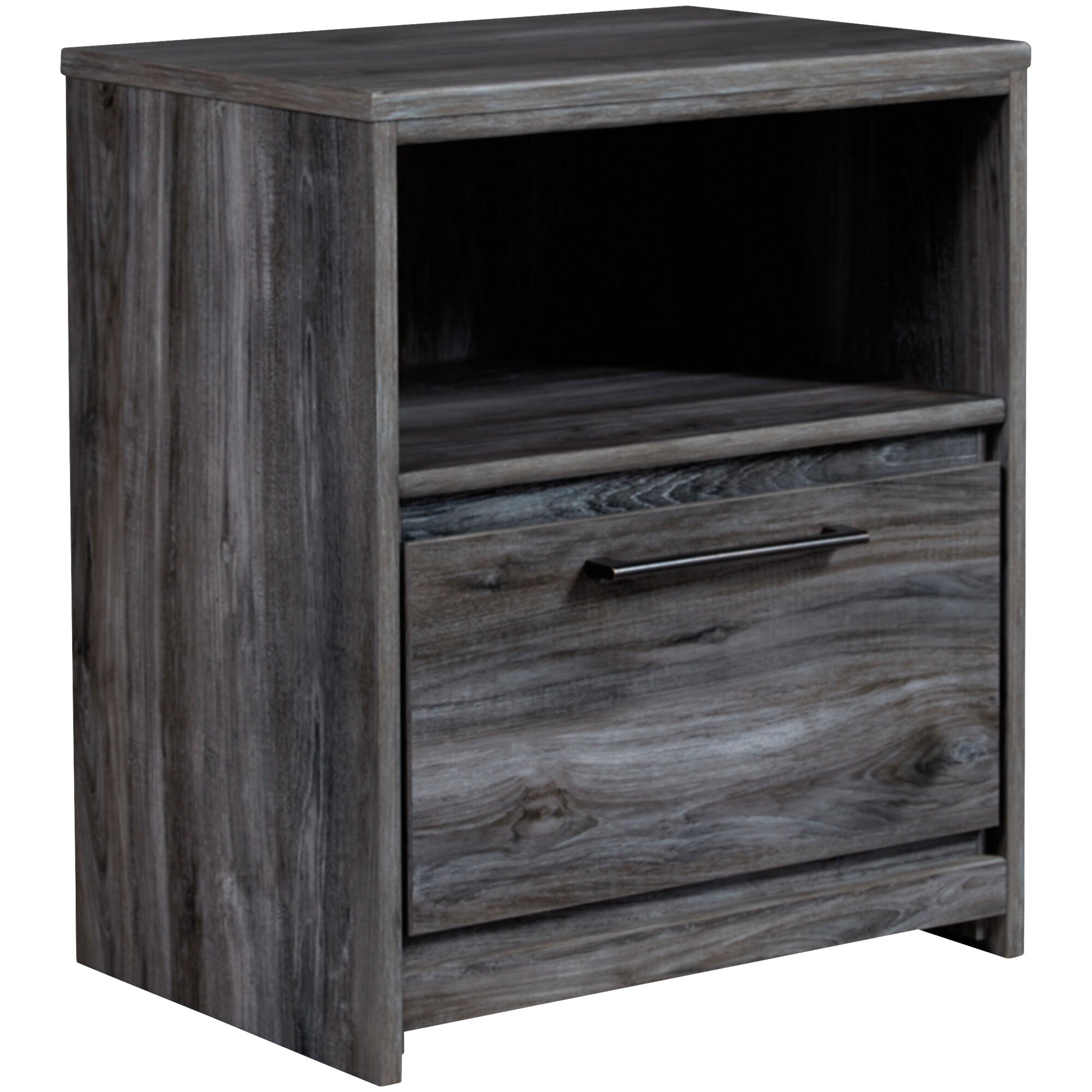 Enjoy the rustic chic of the Baystorm nightstand. Its casual, driftwood-inspired look will complement your modern or transitional bedroom. Made of engineered wood, it has a replicated woodgrain look and a smoky finish that's both laid-back and eye-catching. An antiqued gunmetal handle adds the perfect accent, and a built-in USB charger in back lets you charge your phone as you sleep. Matched with the rest of the Baystorm collection or your own pieces, this nightstand is a must for setting a relaxing tone in your bedroom.