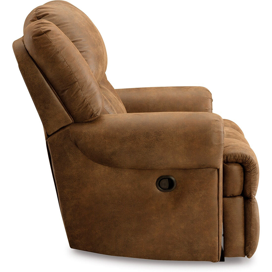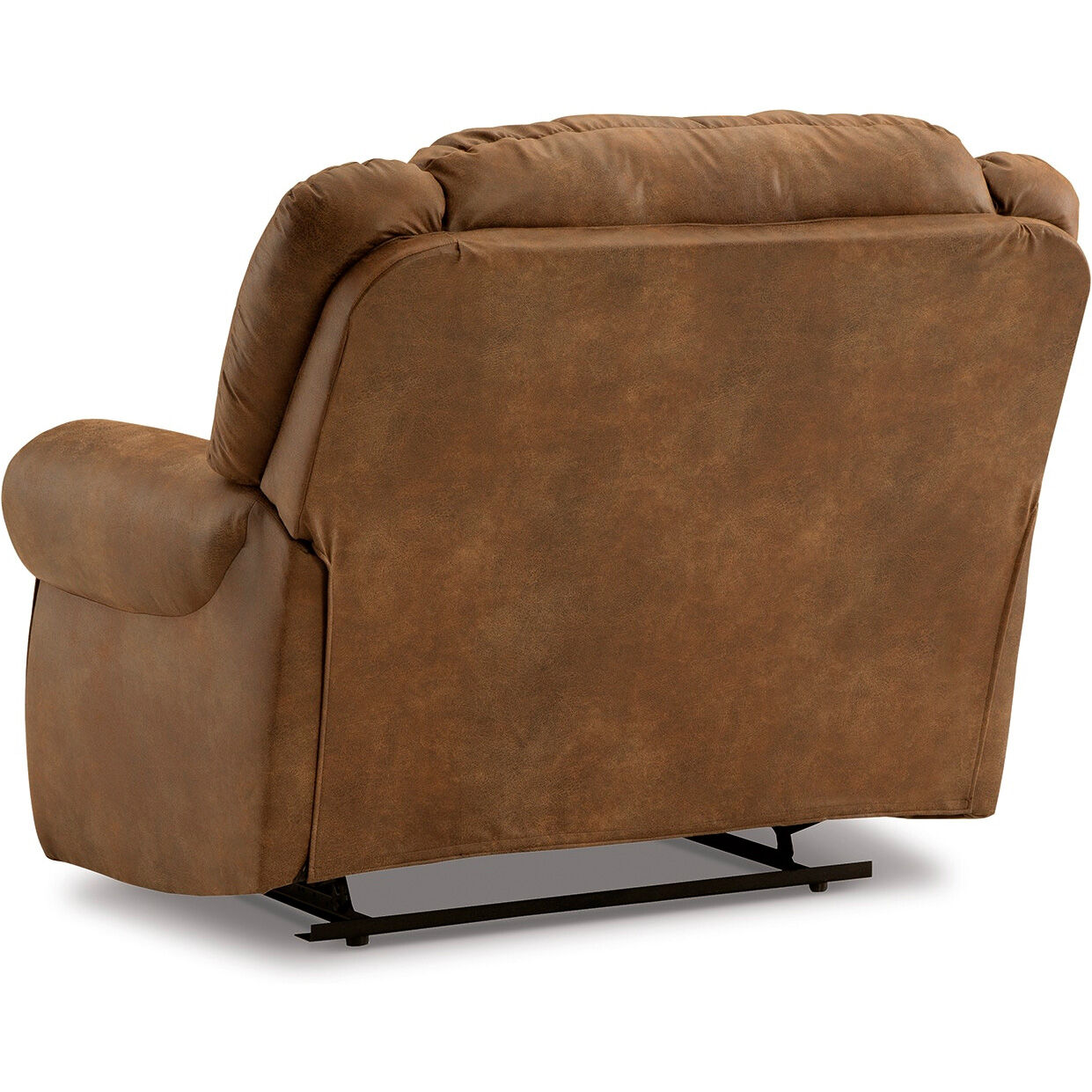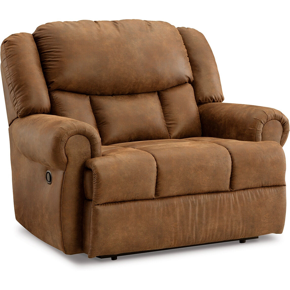Expansive elegance. This oversized recliner makes a sizable style statement. Its large scale enhances the luxe appearance, magnifying the beauty of richly warm brown faux leather. Polishing off the piece is an effortless reclining motion, which adds a layer of function to this masterclass in form.