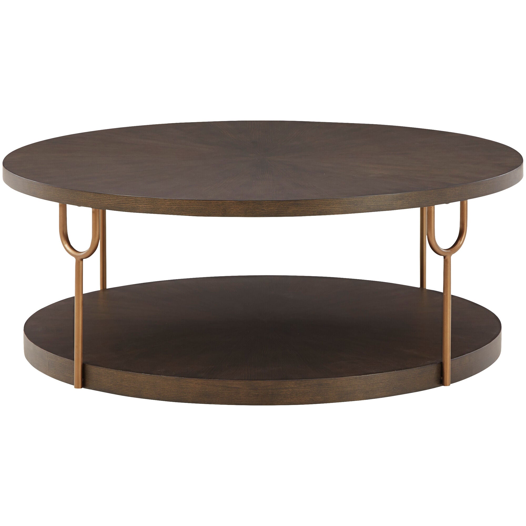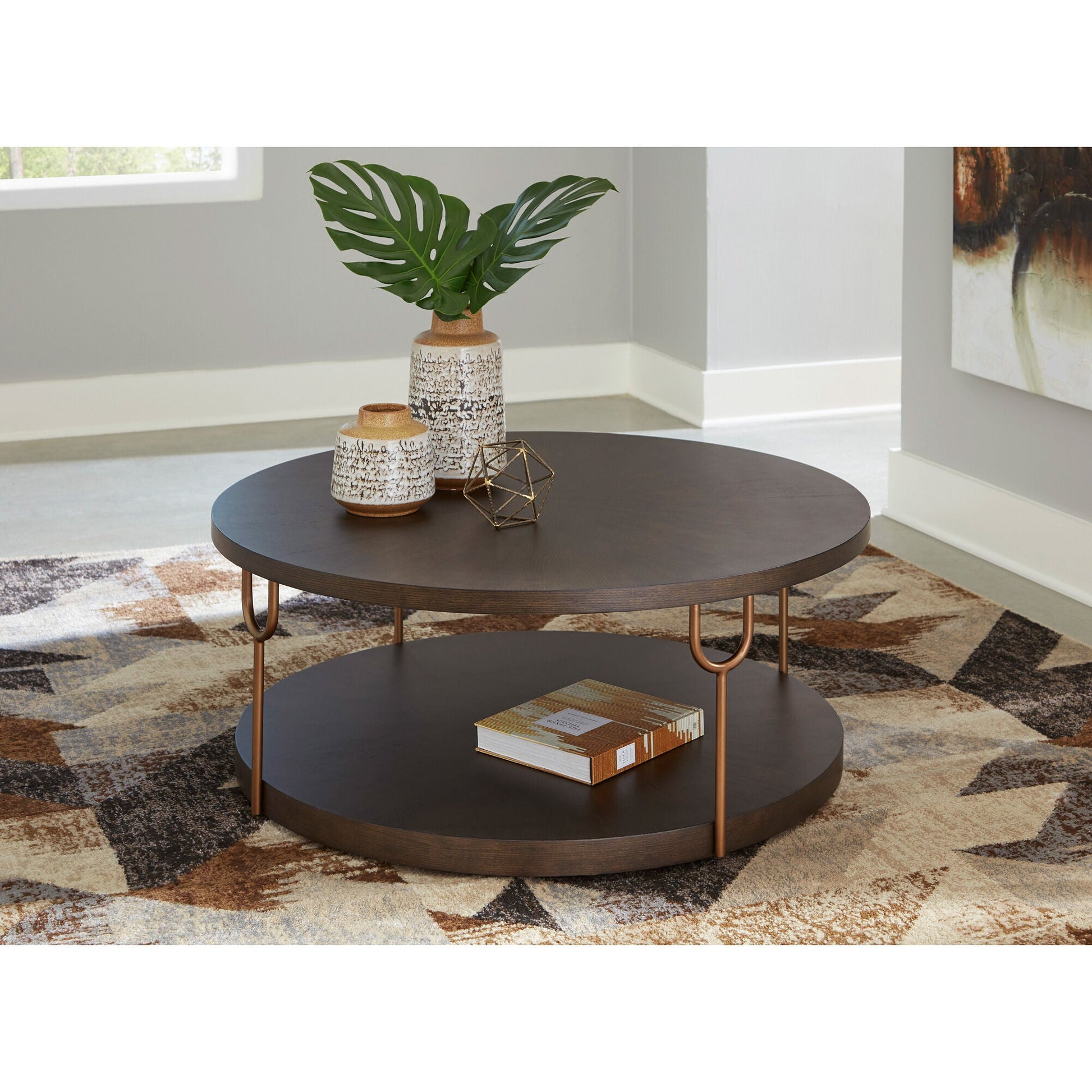 Add a striking accent piece to your living room or bedroom with the Brazburn Coffee Table! This elegantly styled piece of home furniture can fit in with almost any type of home décor, although it is best suited to contemporary design schemes. Allow the artful composition and spartan design of this unique end table to elevate the appearance of your home. This table has chic tubular legs and an espresso wood veneer to complement your existing home design. This round table will provide a great contrast to an angular room scheme or a good addition to more rounded design elements. Get one today!