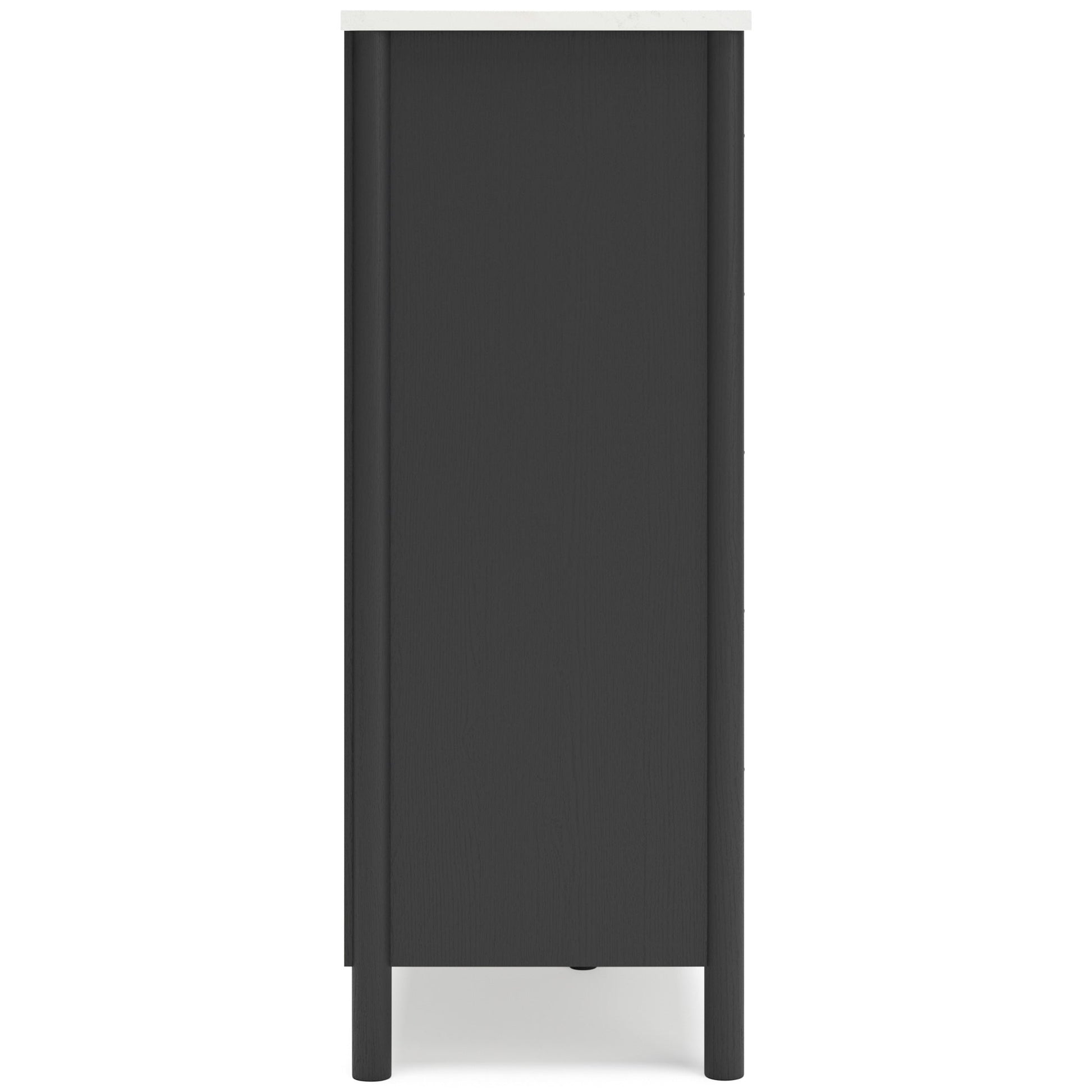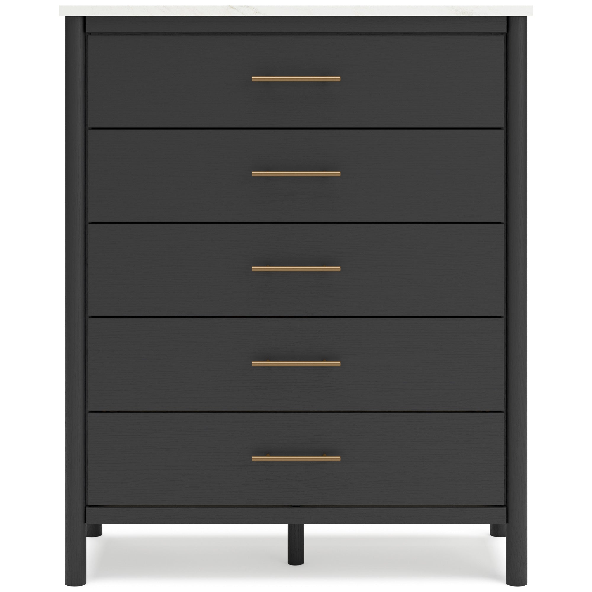 A casual contemporary design with a smooth, light finish and white marble top. 5 Drawers feature smooth side roller glides and champagne colored finished handles. - Product Details provided by Manufacturer, Slumberland not responsible for errors in information.