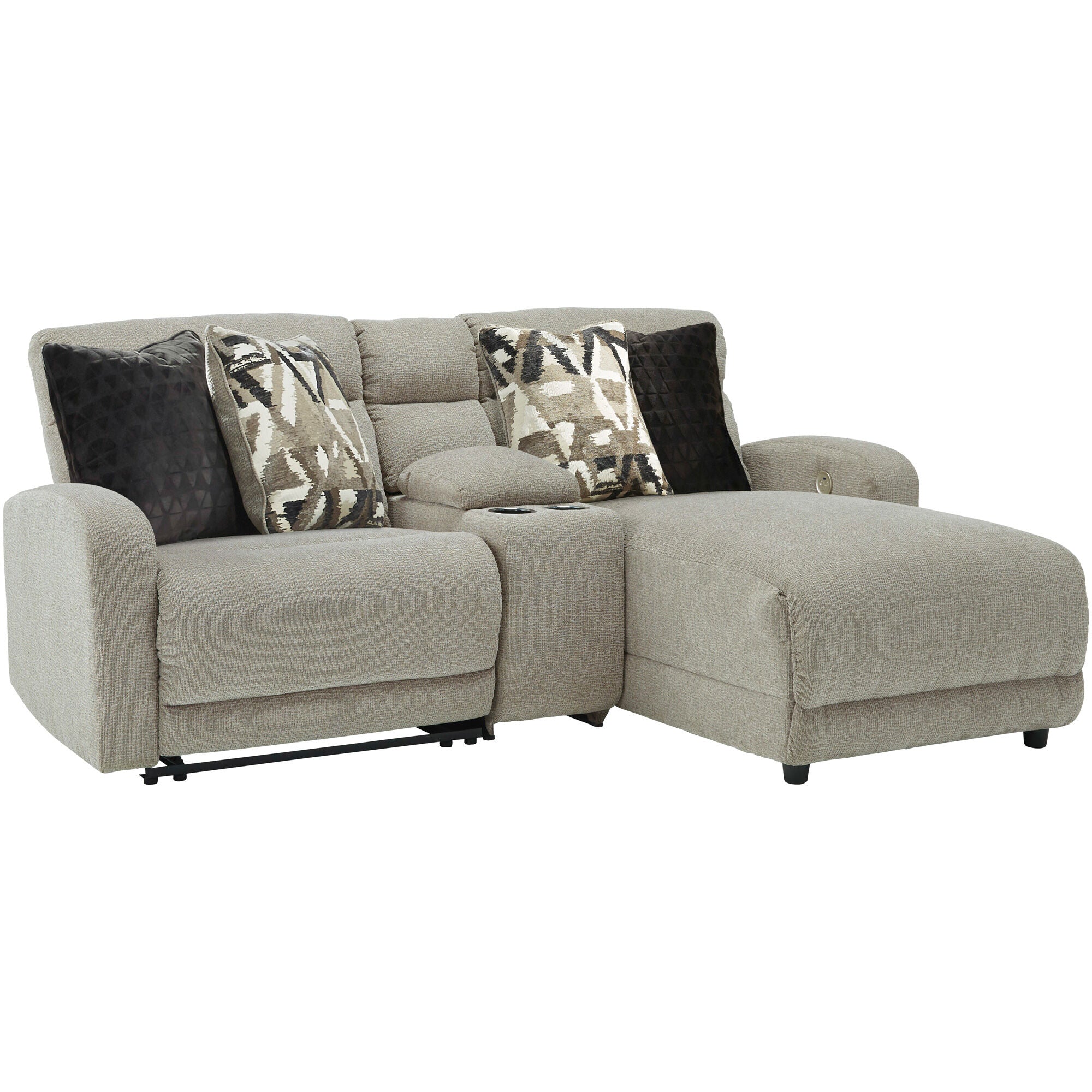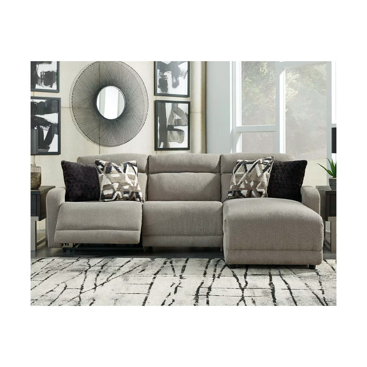 Delightfully modern. Exceptionally comfortable. When it comes to modular furniture with easy-elegant appeal, it's hard to beat this power reclining sectional. Wrapped in a decadently plush stone-tone fabric for neutral versatility, this chic sectional is dressed to impress with a clean-lined divided back, curved track arms and a low-profile back for a relaxed, contemporary aesthetic. - Product Details provided by Manufacturer, Slumberland not responsible for errors in information.