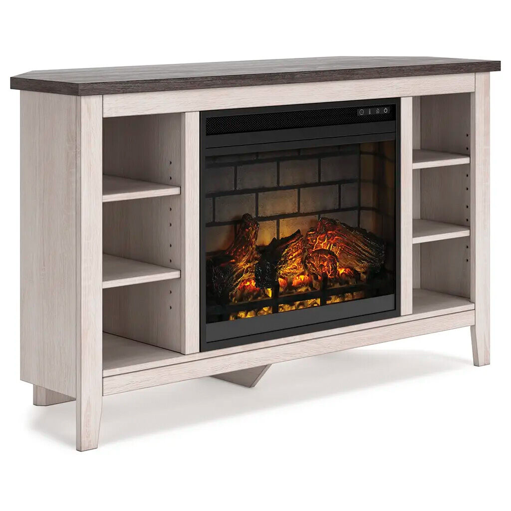 With its minimalist charm, this corner TV stand is right in tune with your relaxed approach to high style. Beautifully shaped to nestle into any corner, it's well equipped with a flexible, open-concept design and cutouts for wire management that enhance the clean-lined aesthetic. What really turns up the heat: an electric fireplace insert with faux firebrick surround that operates with or without infrared heat. The fireplace includes a multi-flame feature, 7-level temperature setting, five brightness levels and an LED glowing embers effect.
