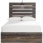 The Drystan panel bed spans the gap between farmhouse and factory. Its rustic reclaimed look complements the down-home country or urban industrial decor with equal ease. The headboard has one or two lighting sconces (depending on size) – handy for reading in bed or simply for ambient lighting. Made of engineered wood with a replicated weathered woodgrain finish. Pair the panel bed with other Drystan pieces for a complete bedroom makeover.