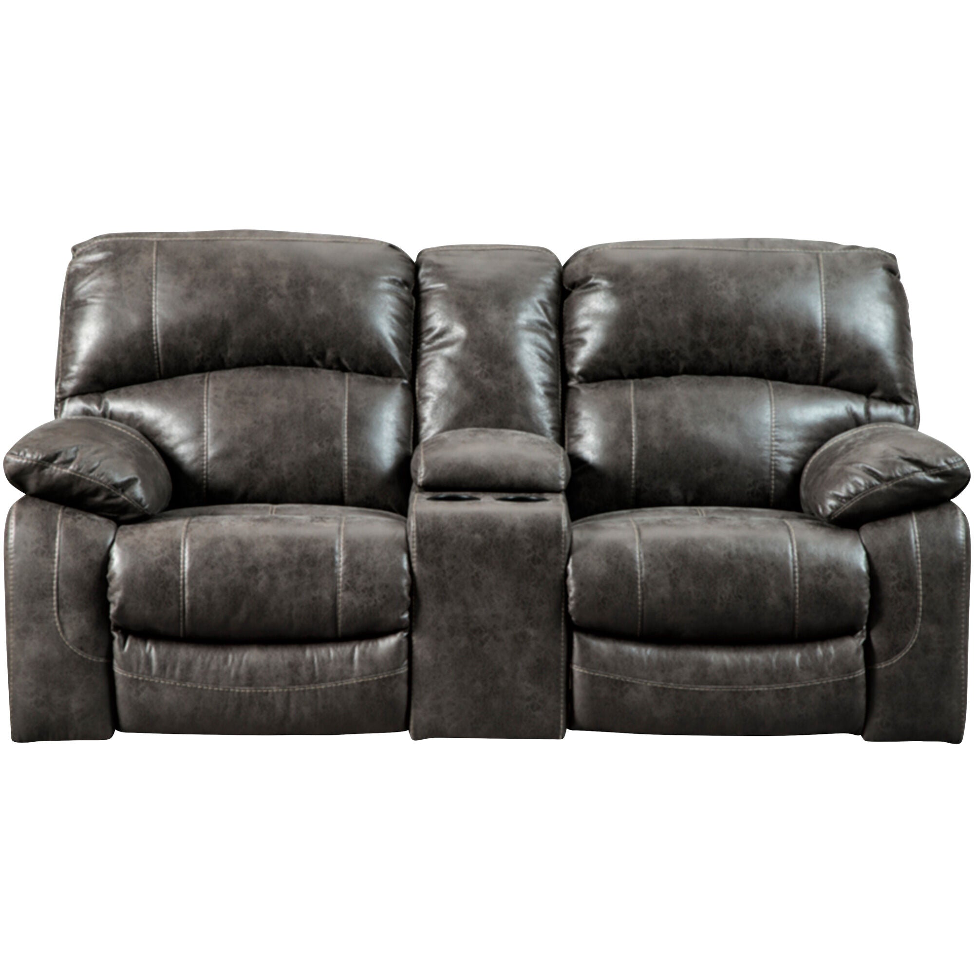 There is power in beauty with this power reclining loveseat. Handsome crackle effect in the upholstery gives the appearance of supple leather but this loveseat is all about the warmth of fabric. Contrast jumbo stitching adds a stylish touch. Double stuffed armrests cuff your body in comfort. Adjust your head and recline back with one easy touch. Dual-sided recliner; middle seat remains stationary. Complete the look with the Dunwell Power Reclining Sofa (sold separately).