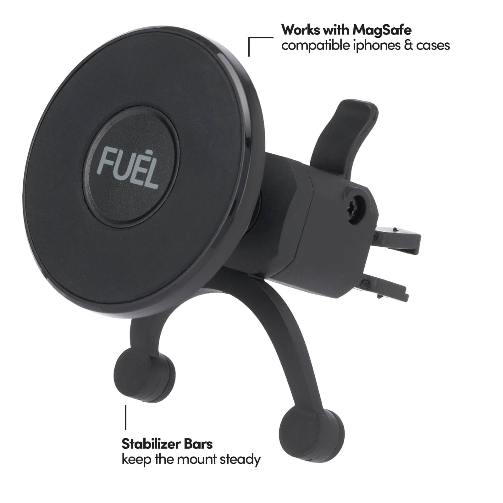 Drive confidently & hands-free with the FUEL Magnetic Car Vent Mount. The mount is compatible with iPhones featuring MagSafe and compatible cases. The scissor lock clasp allows the mount to attach firmly to most car vents, and the place & go adjustable magnetic head keeps your phone securely in place while the lower brackets keep the mount steady.