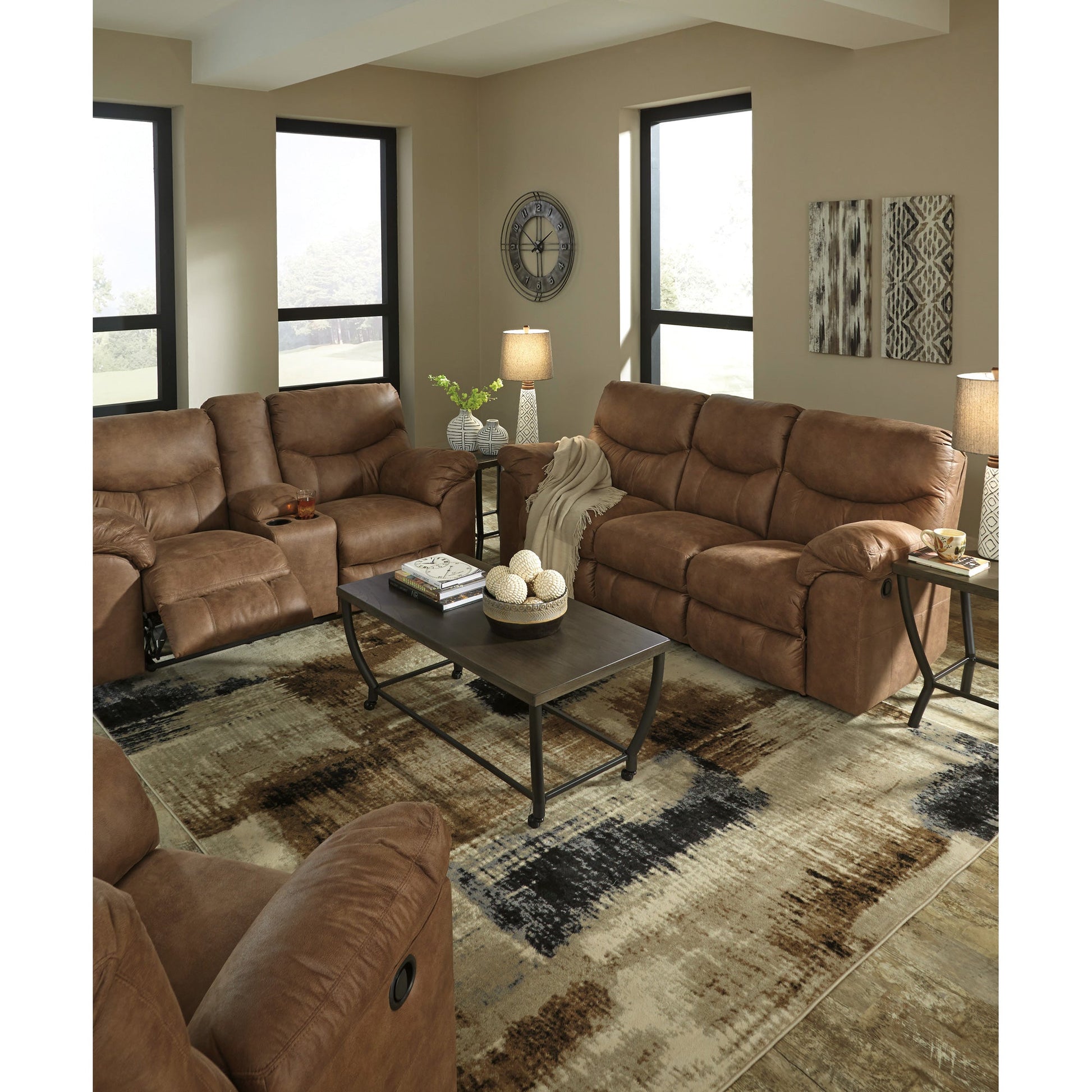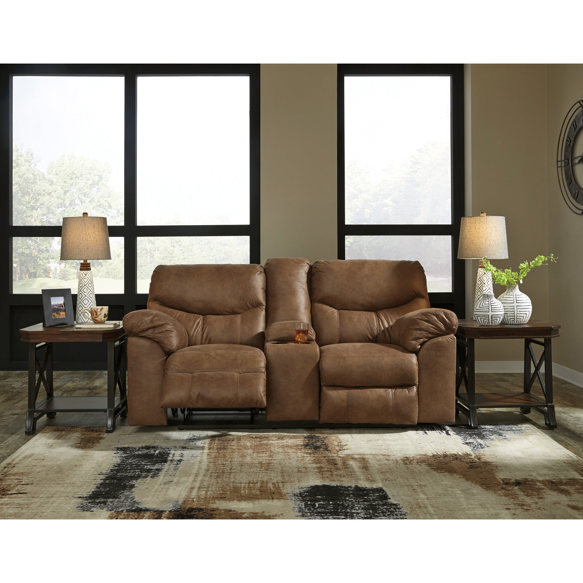 The Heligan reclining console loveseat captures the look and feel of leather without the price tag. This indulgently soft leather-look fabric loveseat features double stuffed armrests and sumptuous padding in all the right places. Great for any casual contemporary or transitional home, this loveseat includes a handy storage console and beverage holders in the center, and dual recliners with pull tab reclining motion. Quality construction includes a corner-blocked frame with metal reinforced seat, and high-resiliency foam cushions wrapped in thick poly fiber. Leather-look upholstery is made of polyester/polyurethane.
