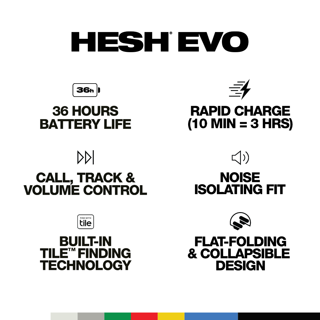 Hesh Evo wireless over-ear headphones feature 38 hours of battery, rapid-charge technology, a collapsible design, Tile™ tracking and Bluetooth® 5.0 wireless technology.