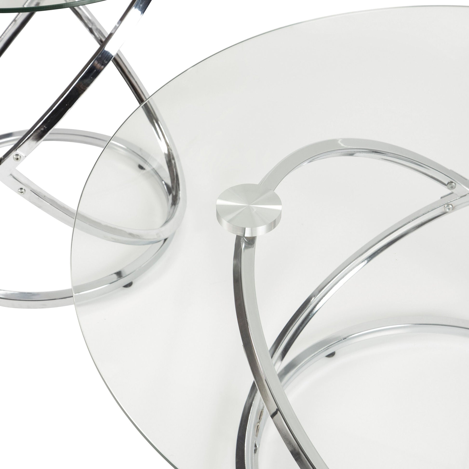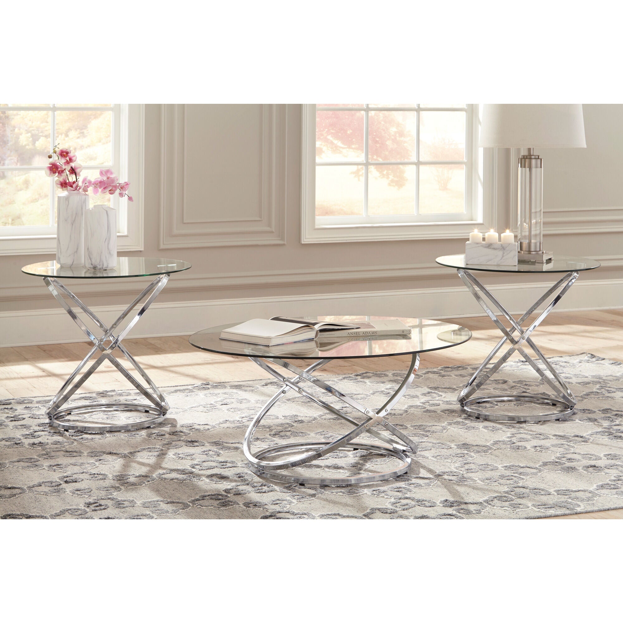 A round coffee table set well worth the wait. Made of chrome-tone metal and clear tempered glass with polished edges, the Hollynyx 3 Pack offers a masterfully modern look with minimal fuss. Includes 1 coffee table and 2 end tables.