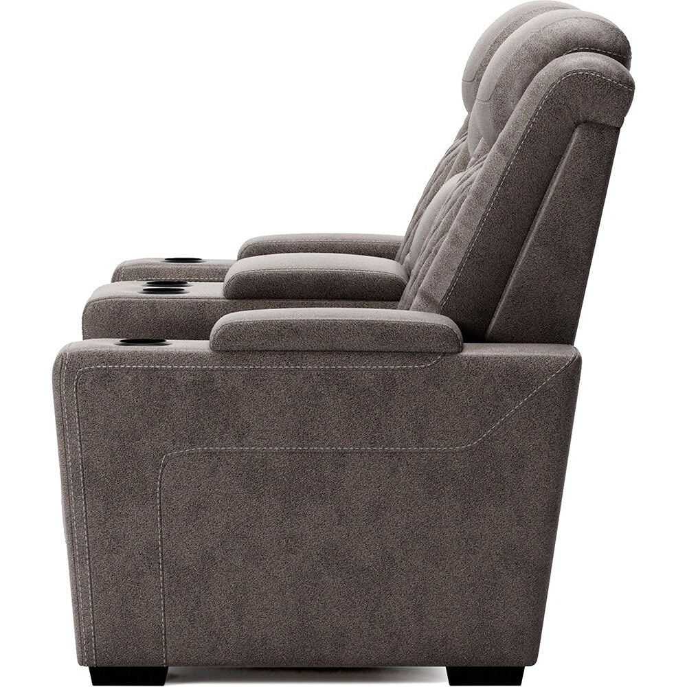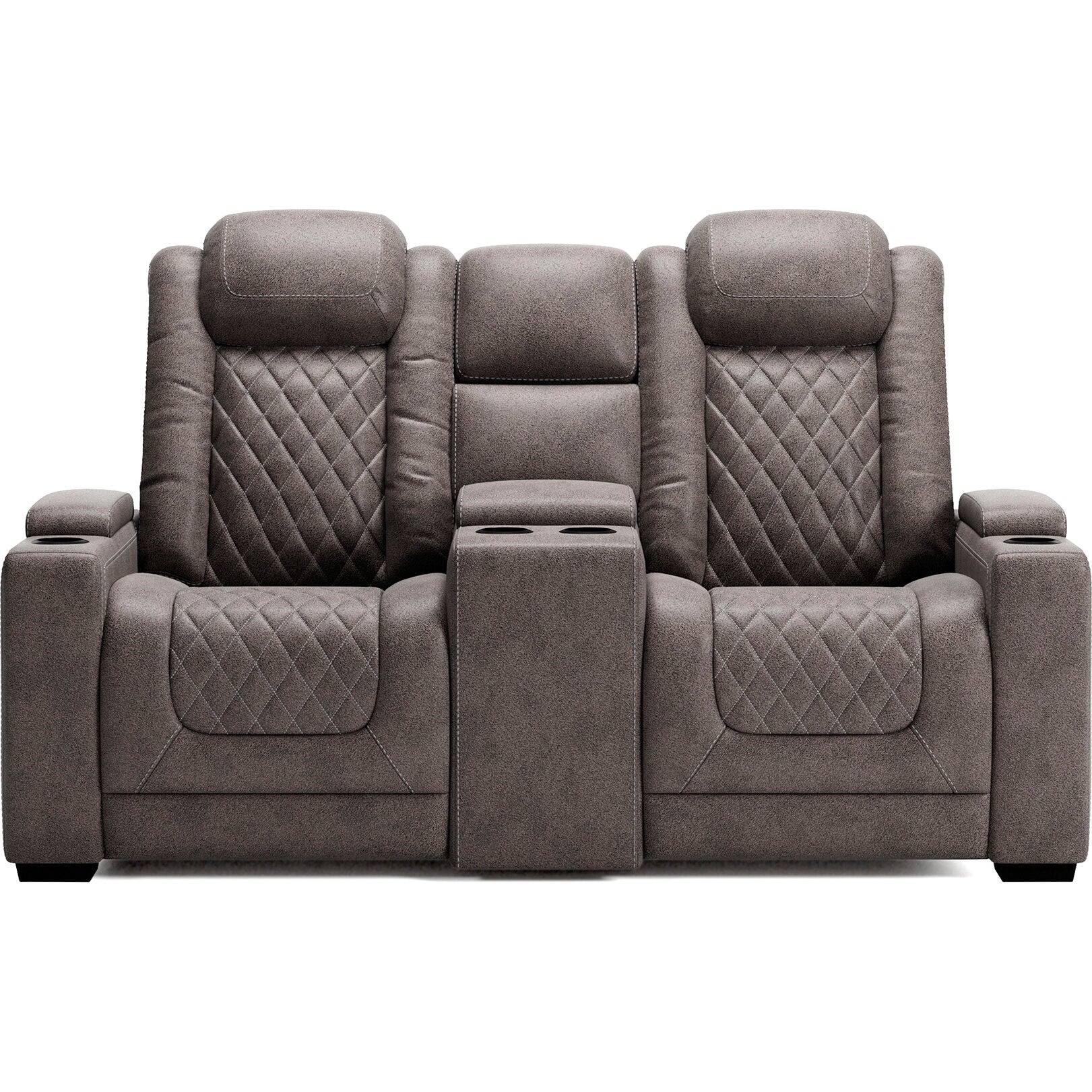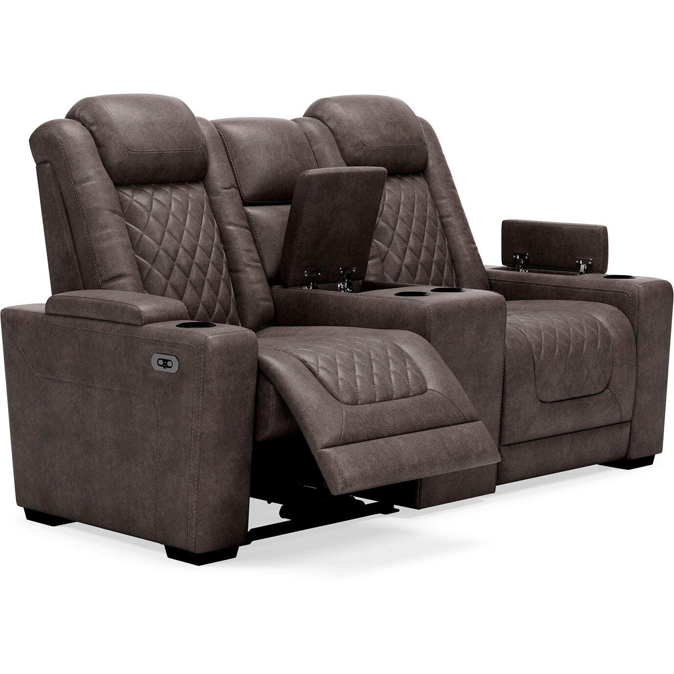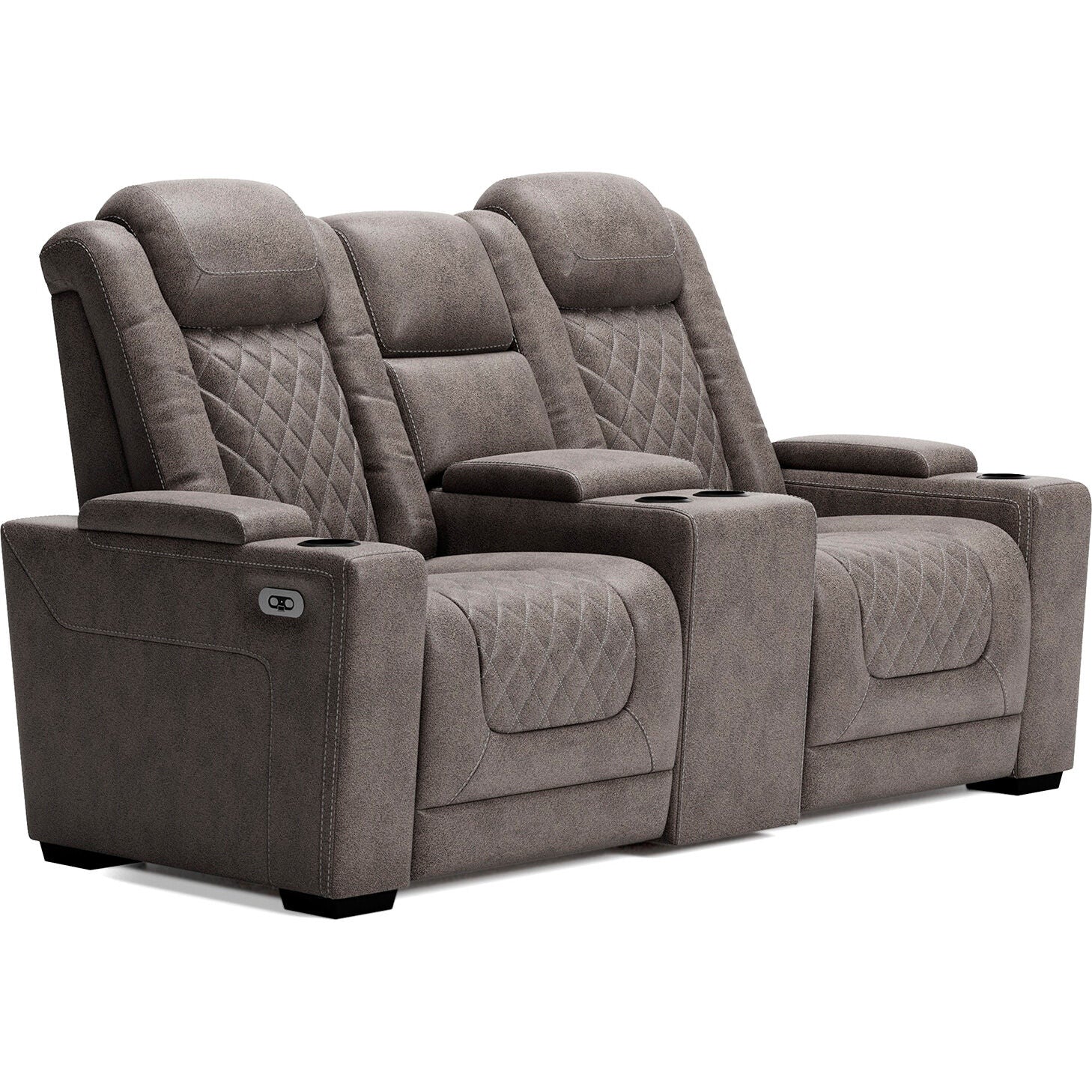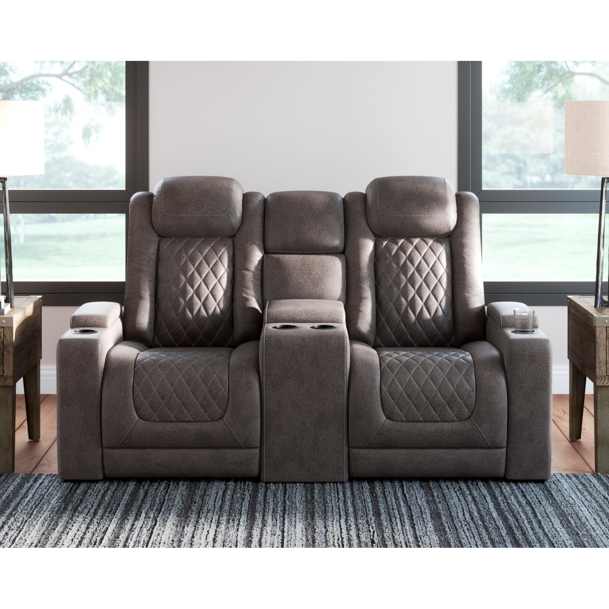 This power reclining loveseat in trendy gray is proof of just how far recliners have come when it comes to form and function. Ultra cool and contemporary, this fully loaded power reclining loveseat makes it so easy to social distance and make home your haven. Dressed to impress with diamond stitching inspired by sports car interiors, this reclining loveseat is covered in a fabulous faux leather with pebbled effect for authenticity. High-tech advancements include a one-touch power control with Easy View™ adjustable headrest and USB plug-in. Hidden storage compartments in the armrests and console are a welcome touch. - Product Details provided by Manufacturer, Slumberland not responsible for errors in information.