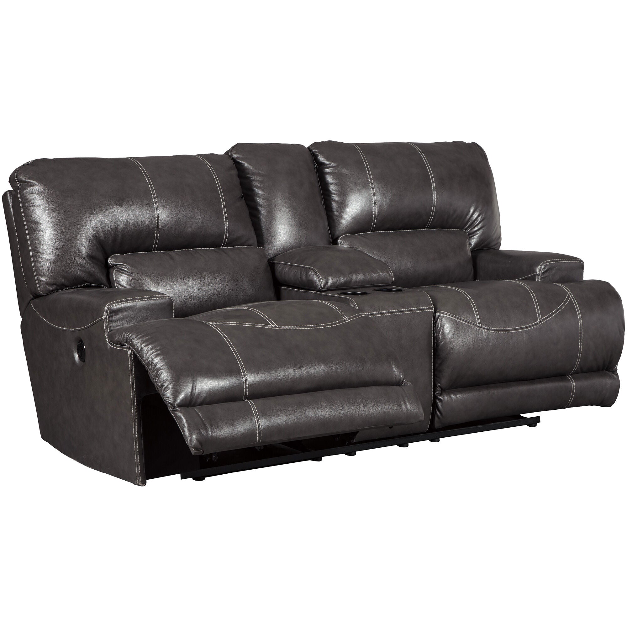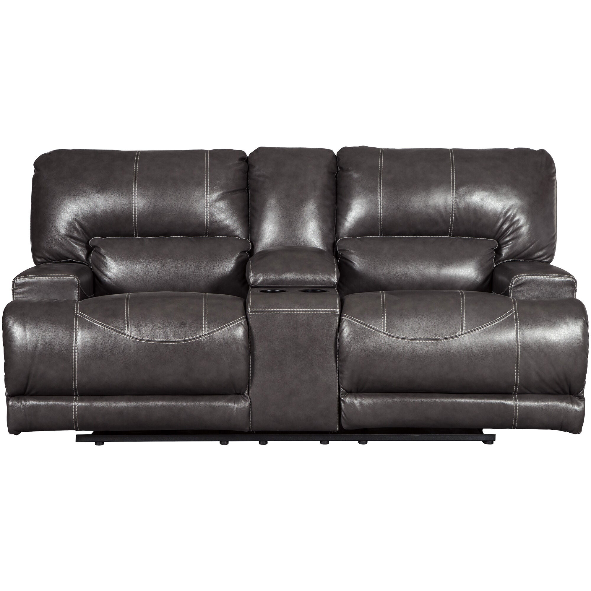 Sink into this supple power reclining loveseat and prepare to be swept off your feet— literally! Extra-wide seats and plush cushioning are divinely comfortable. The seating area is wrapped in decadently soft leather for a luxurious experience, while a perfect leather-match upholstery on the exterior saves you money without sacrificing style. Prominent stitching, linear track arms and a goes-with-anything gray/silver hue add stylish touches that are sure to complement any aesthetic beautifully. Keep beverages and remotes close at hand thanks to the center console and cup holders. Complete the look with the matching McCaskill Oversized Power Recliner (sold separately).