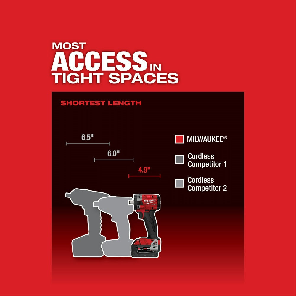 The MILWAUKEE® M18 FUEL™ 1/2" Compact Impact Wrench w/ Friction Ring is the most compact in its class, delivering the most access in tight spaces, up to 250 ft-lbs of nut-busting torque, and maximum workspace visibility. The Milwaukee cordless impact wrench measures only 4.9" in length with a POWERSTATE™ Brushless motor to provide the power to remove stubborn fasteners, even in confined spaces. The Milwaukee 3/8" impact wrench has tri-LEDs that surround the anvil to deliver brighter light with fewer shadows. 4-Mode DRIVE CONTROL™ offers greater precision with a range of pre-set RPM and IPM levels, selectable from a single button on the tool. By selecting Mode 4, AUTO SHUT-OFF™ control applies no more than 20 ft-lbs of torque for hand-tight fastening applications to prevent overtightening. Mode 4 also features Bolt Removal Control delivers full torque output, then decreases RPMs once the bolt is loosened to prevent fastener drops. REDLINK PLUS™ Intelligence electronics make these controls possible while ensuring maximum performance, protecting the tool against overloads, over-heating, and over-discharge. The included M18™ REDLITHIUM™ 2.0Ah battery pack fits M18™ tools, delivering more work per charge and more work over the life of the pack.