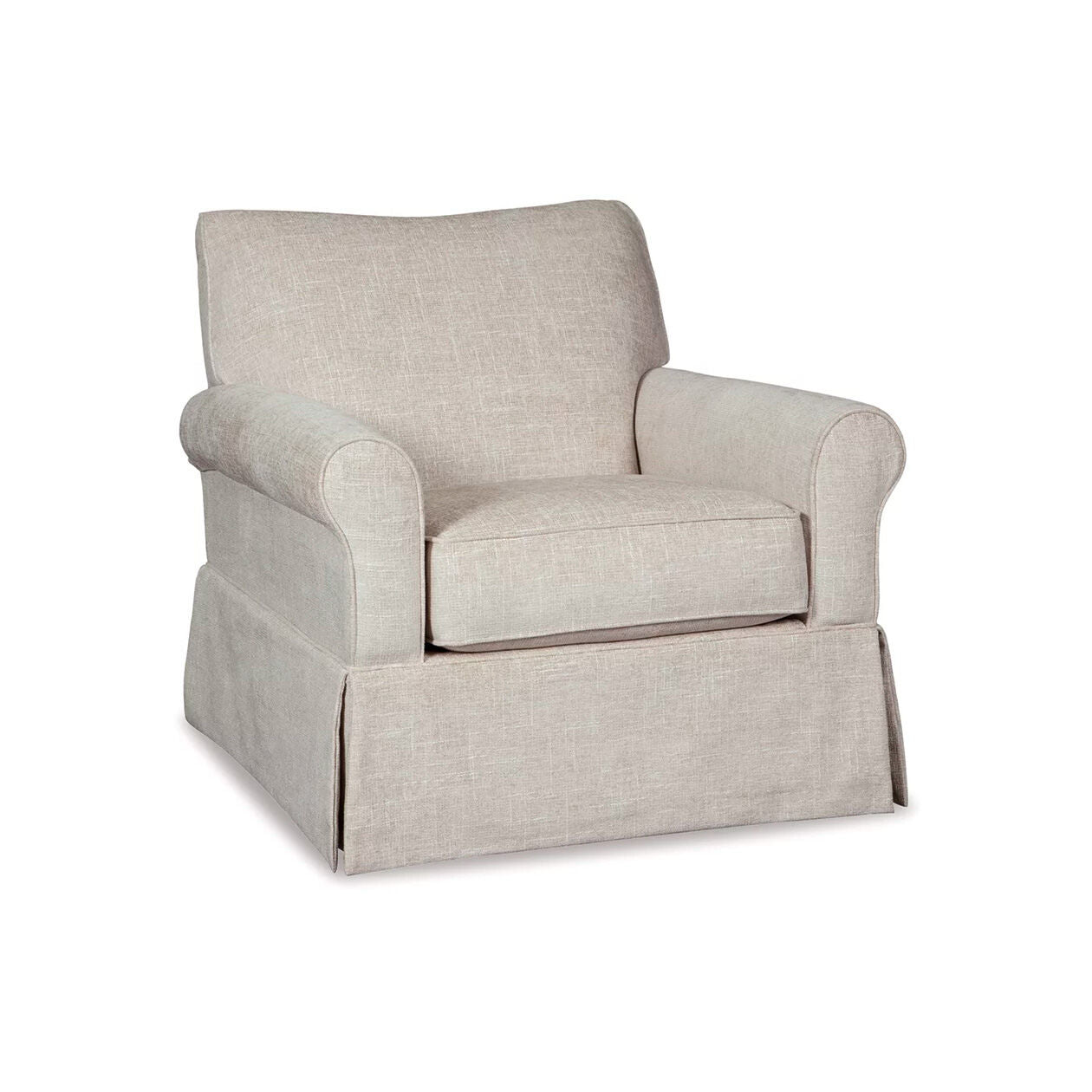 Thanks to its tailored skirt, this swivel glider accent chair sure doesn't look like it can do a 360, but you'll love the fact that it can. Whether your style is shabby chic, modern farmhouse or American classic, this swivel chair is sure to be sitting pretty.