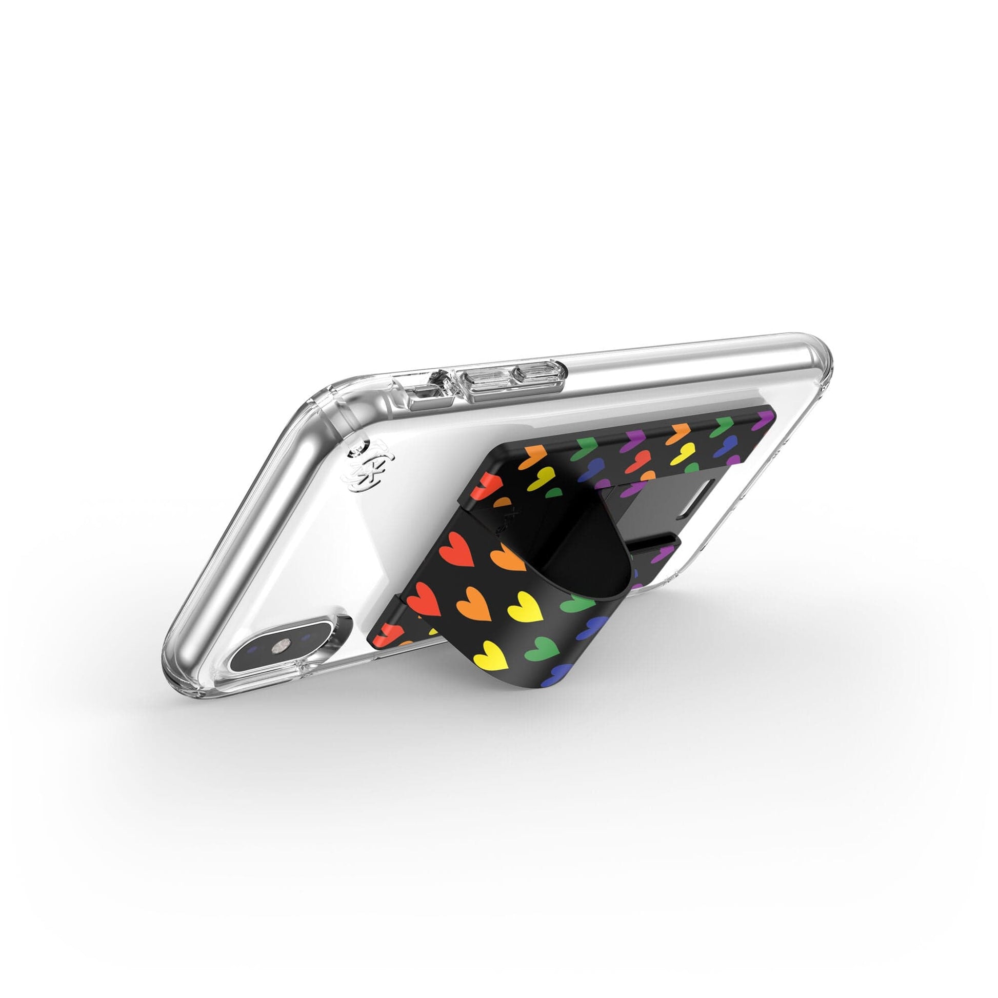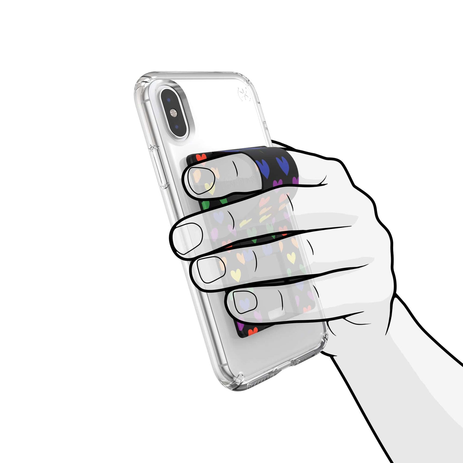 GrabTab® is a card-sized super-slim (3mm thick) accessory that gives you a secure way to hold your phone or stand it up for viewing—and also allows for wireless charging. Just stick GrabTab® to the back of your phone and slide the flexible center strip until it locks in place. Slip your fingers through the loop to hold your phone comfortably while taking selfies, texting, and more. Turn your phone sideways, and the loop becomes a convenient stand for watching videos or hands-free chatting.