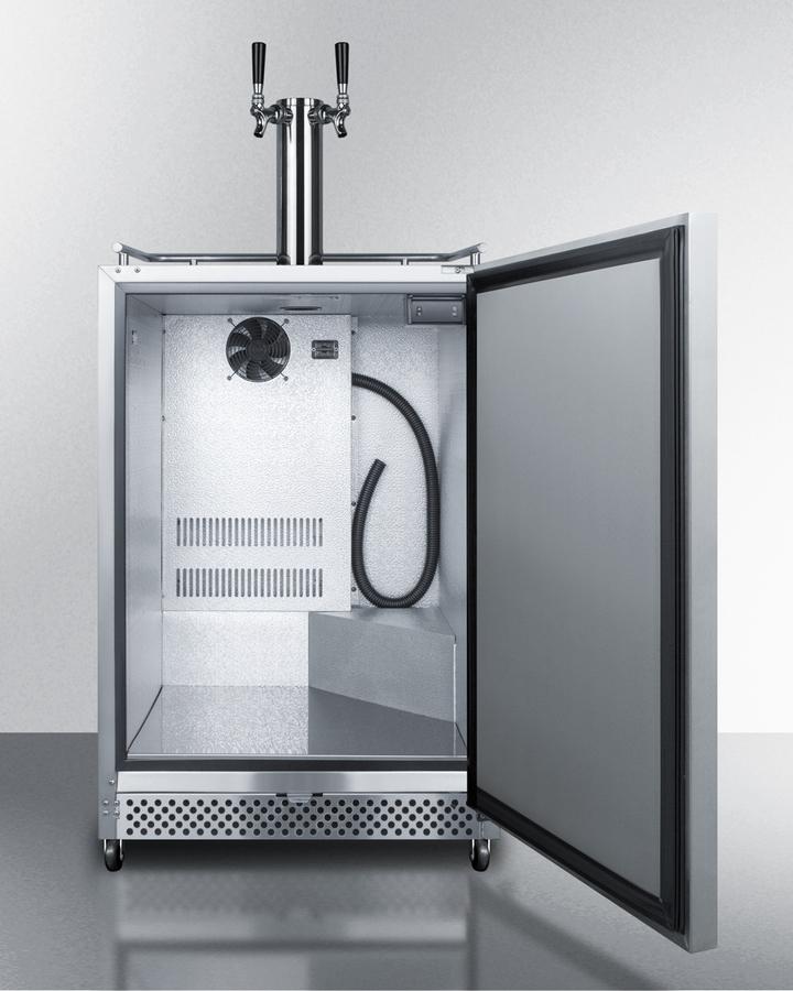 Summit Commercial brings quality construction and long-lasting reliability to outdoor and indoor settings with the SBC695OS beer dispenser series. The SBC695OSTWIN is a full-sized weatherproof kegerator that can be used indoors or outdoors. It is ETL-S listed to NSF-7 standards and meets UL-471 for commercial applications. The cabinet and door are wrapped in 304 grade stainless steel, with a sealed back designed to protect all electrical components from the elements. This unit features a front-breathing system that allows built-in installation under counters, as well as a fully finished exterior for optional freestanding use. A caster set is included for optional mobility, along with a durable top rail guard. The user-reversible stainless steel door is self-closing to ensure your kegs aren't accidentally exposed to warmer temperature, with an audible alarm that warns if the door is left open for over one minute. This unit includes a stainless steel kickplate and horizontally mounted handle in a sleek blade shape, ideal for matching many popular styles of grills and cabinetry. A factory-installed front lock offers added security. Inside, the SBC695OSTWIN comes with hammered aluminum walls and a stainless steel floor designed to protect the interior when loading heavy kegs. A digital thermostat lets you set the temperature with reliable precision, with a wide range between 32 and 50 F to accommodate a variety of brews. A high/low temperature alarm sounds if the unit's interior goes out of safe storage conditions. We include a complete commercially listed Sankey tap system and twin style draft tower, along with a 5 lb. CO2 tank and regulator. This unit utilizes automatic defrost for low maintenance use. An interior LED light is included to help make the keg setup process more convenient. With its solid construction, user-friendly features, and attractive design, the SBC695OSTWIN is the perfect beer dispenser for indoor or outdoor commercial applications. Additional tap styles are available.