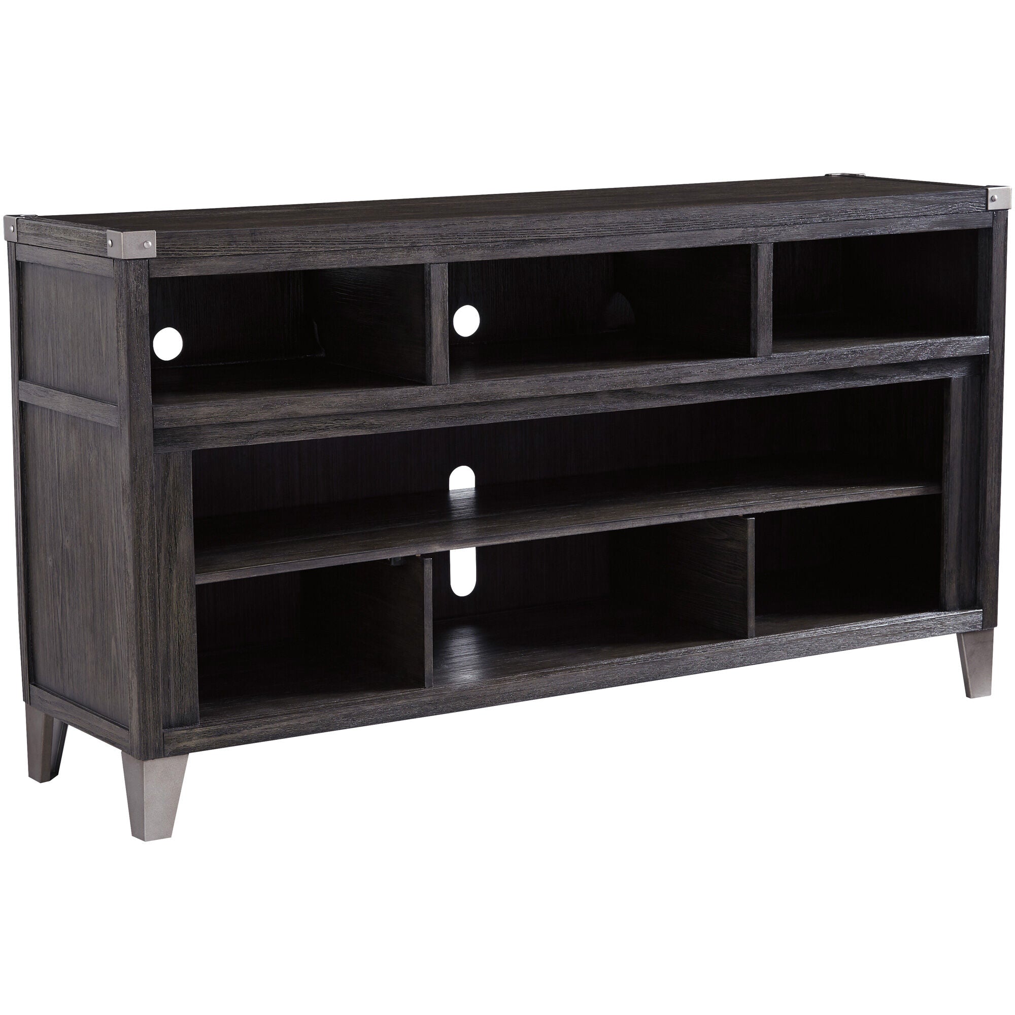 Make watching TV a joy with this large TV stand. Top surface accommodates up to 70-inch TVs. Its rustic-industrial style is sure to complement any contemporary decor through gray coloration, squared edges, zinc-tone corner bracket accents and nailhead detailing. Several vented open cubbies offer impressive shelf space, convenient for keeping all of your electronic gear within reach. Handy cutouts keep cords out of sight. Large center opening accommodates shelving insert (included) or the W100-22 large fireplace unit (sold separately). - Product Details provided by Manufacturer, Slumberland not responsible for errors in information.