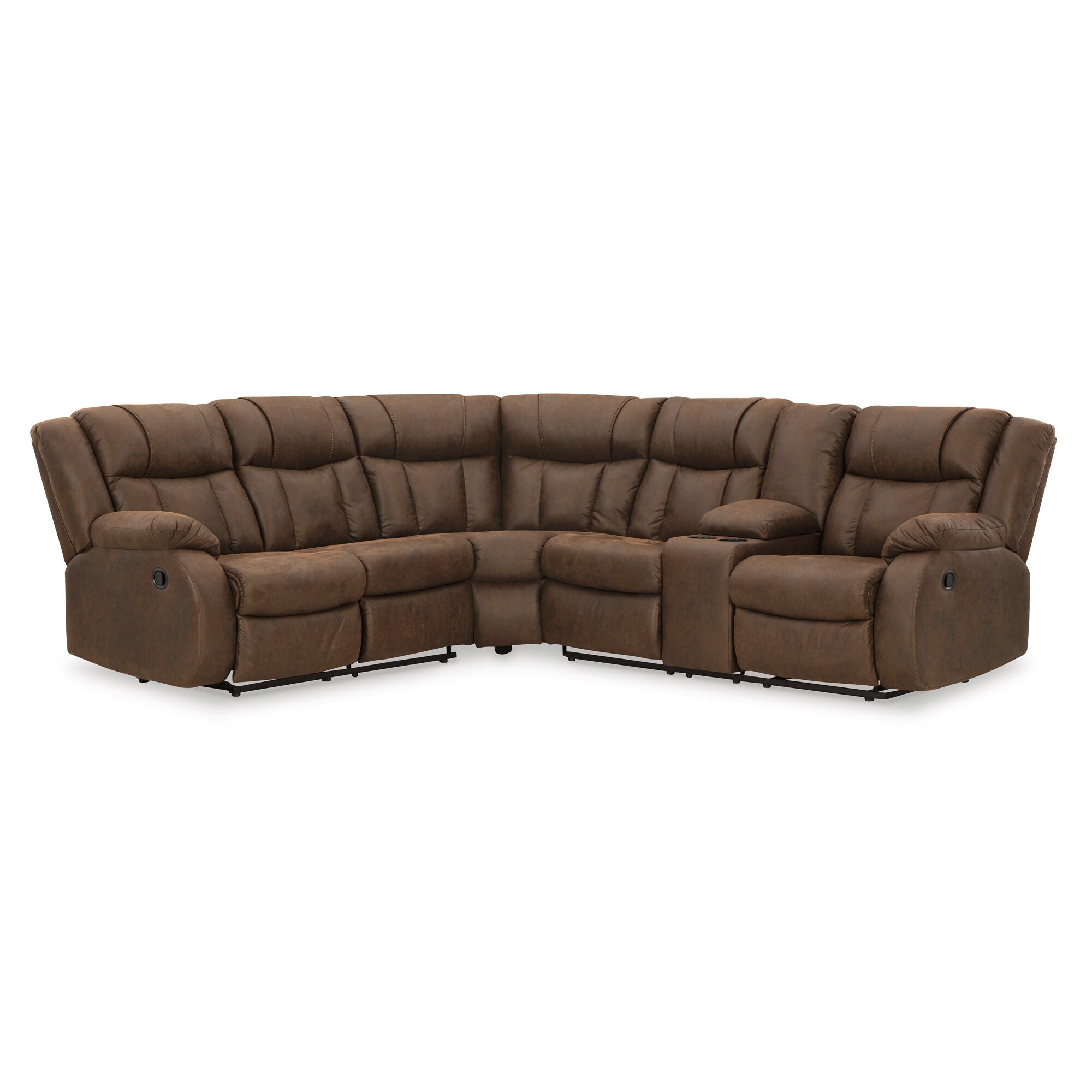 Melt into comfort at the end of your day. Accented by jumbo stitching, the supple walnut faux leather and sumptuous cushioning cradle your body in infinite positions of leisure. Simply pull the tab to recline. With dual cup holders and convenient console storage, this reclining sectional makes relaxation your sweet reward for all you do. - Product Details provided by Manufacturer, Slumberland not responsible for errors in information.