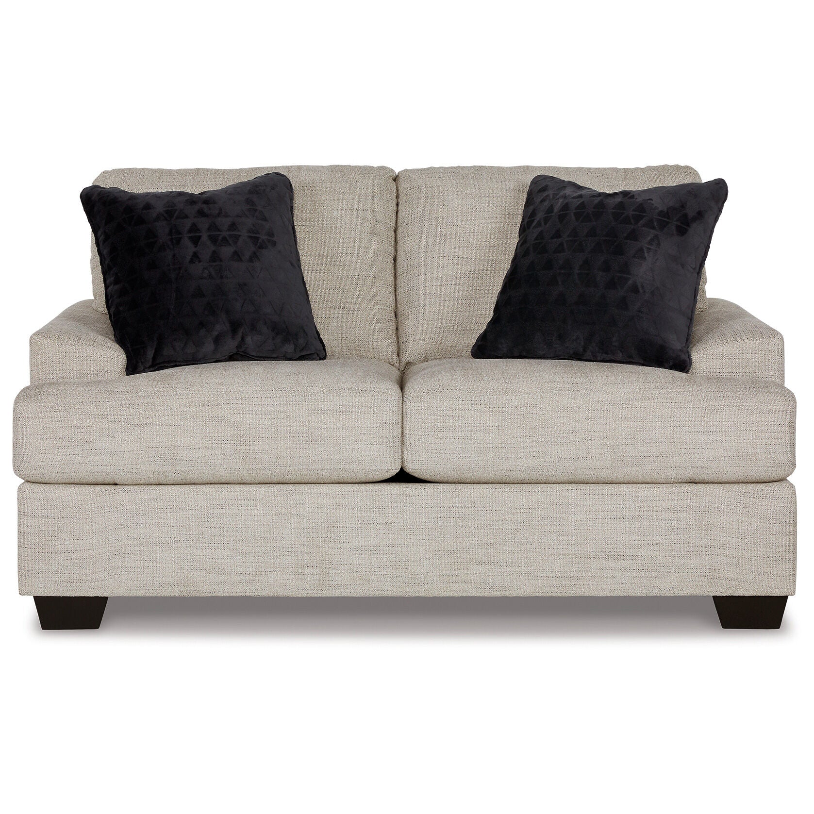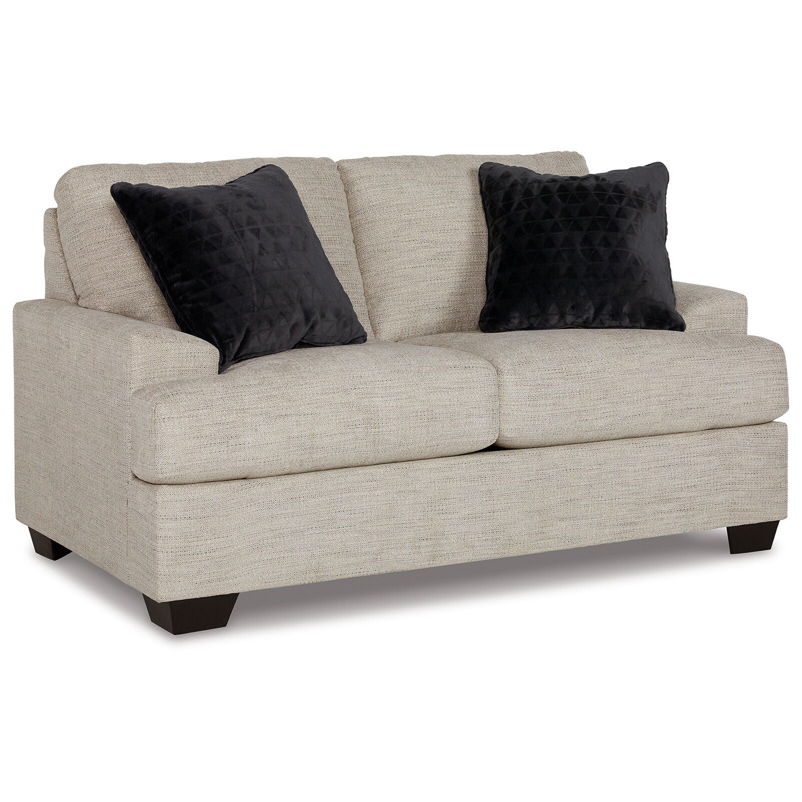 Laid-back luxury meets neutral practicality in this loveseat. Taking its cues from contemporary design, the clean-lined piece is outfitted with angular arms for a layer of geometric expression. Softly upholstered, sizable cushions keep you comfortable, while black faux fur accent pillows bring a touch of soft glam. With this loveseat, winning style and superb functionality go hand in hand.