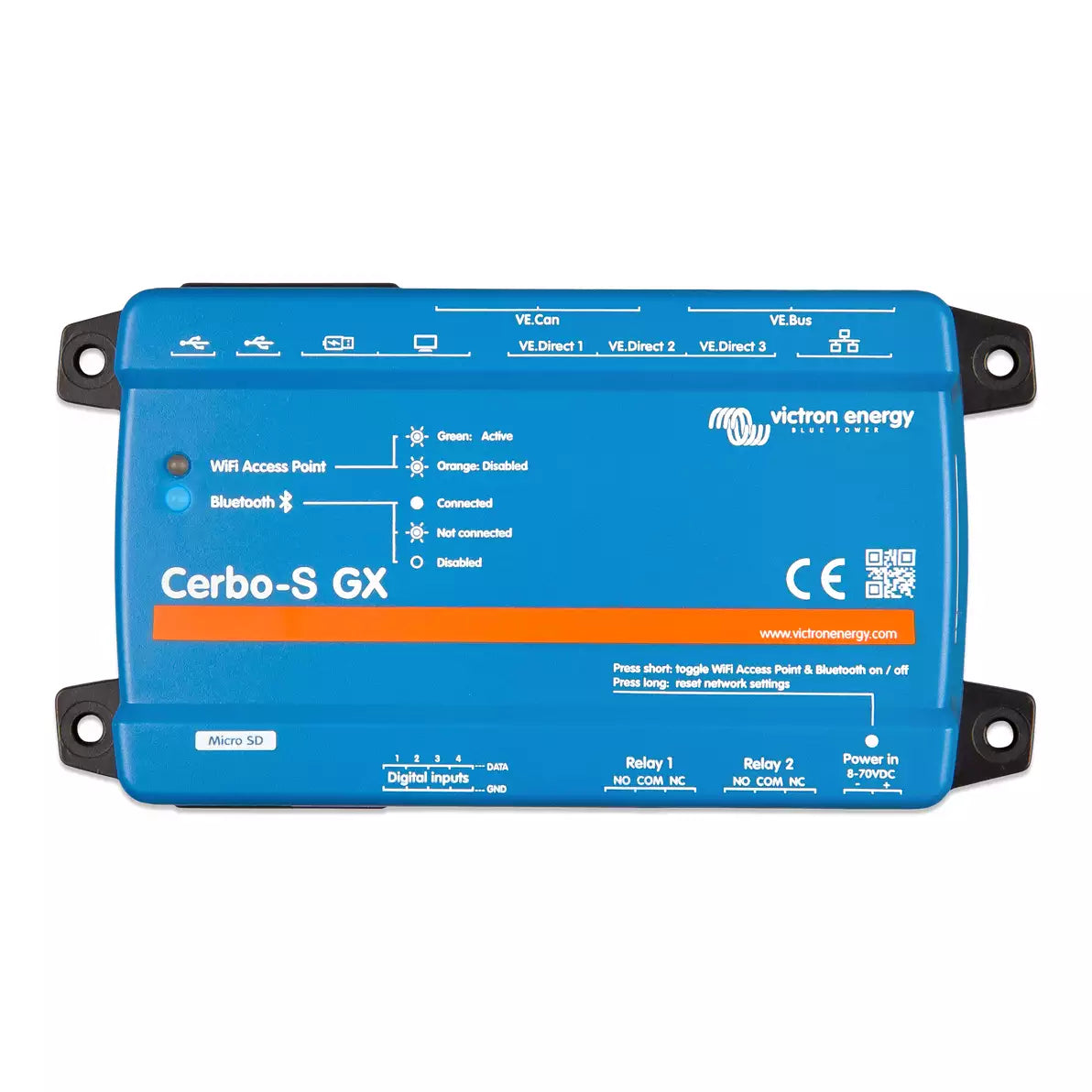 The Cerbo GX has been optimized for professional installers, making it easy to mount on a DIN-Rail and connect to a separate touchscreen. Its new Bluetooth feature allows for quick configuration via the VictronConnect app, eliminating the need for multiple wires and perfect cut-outs.