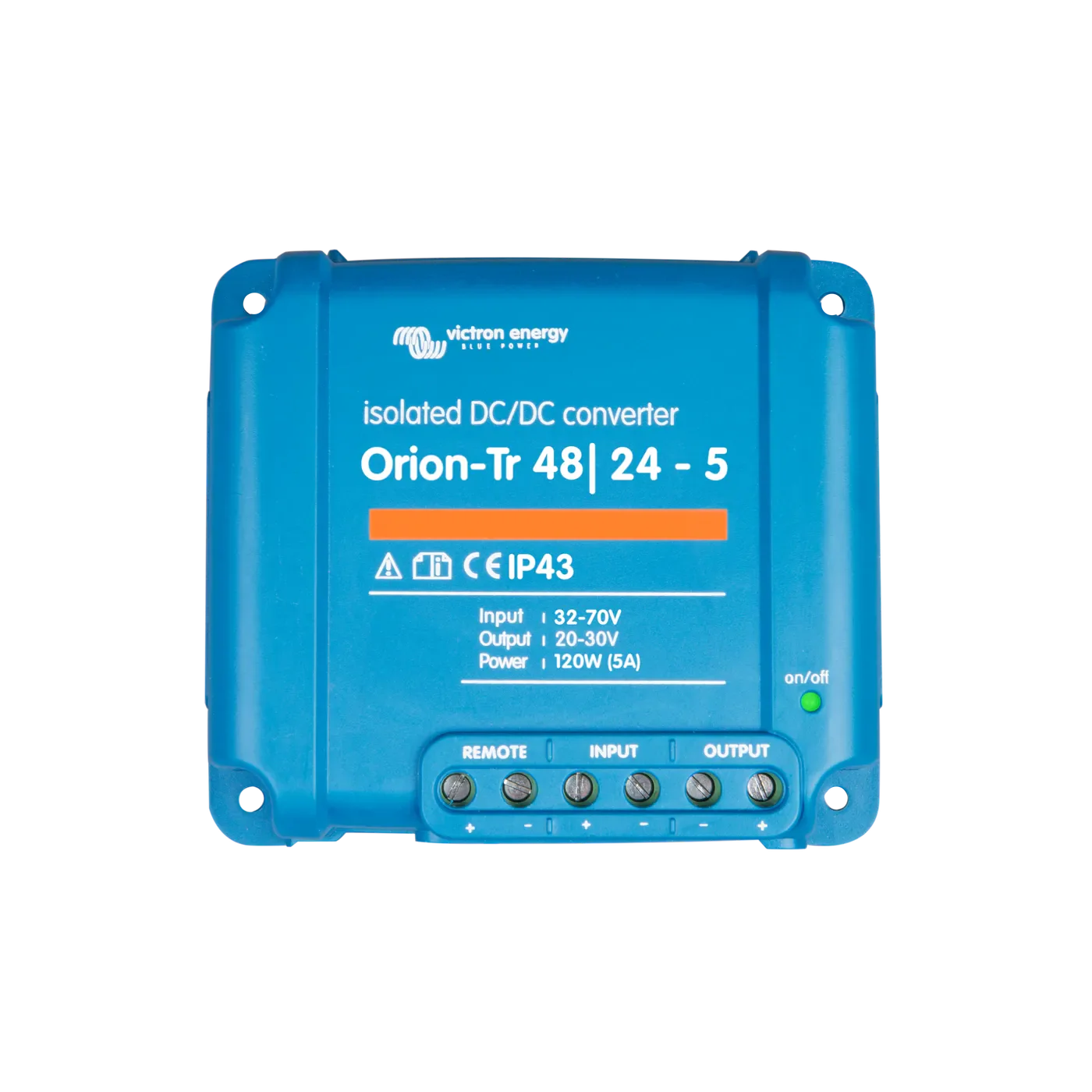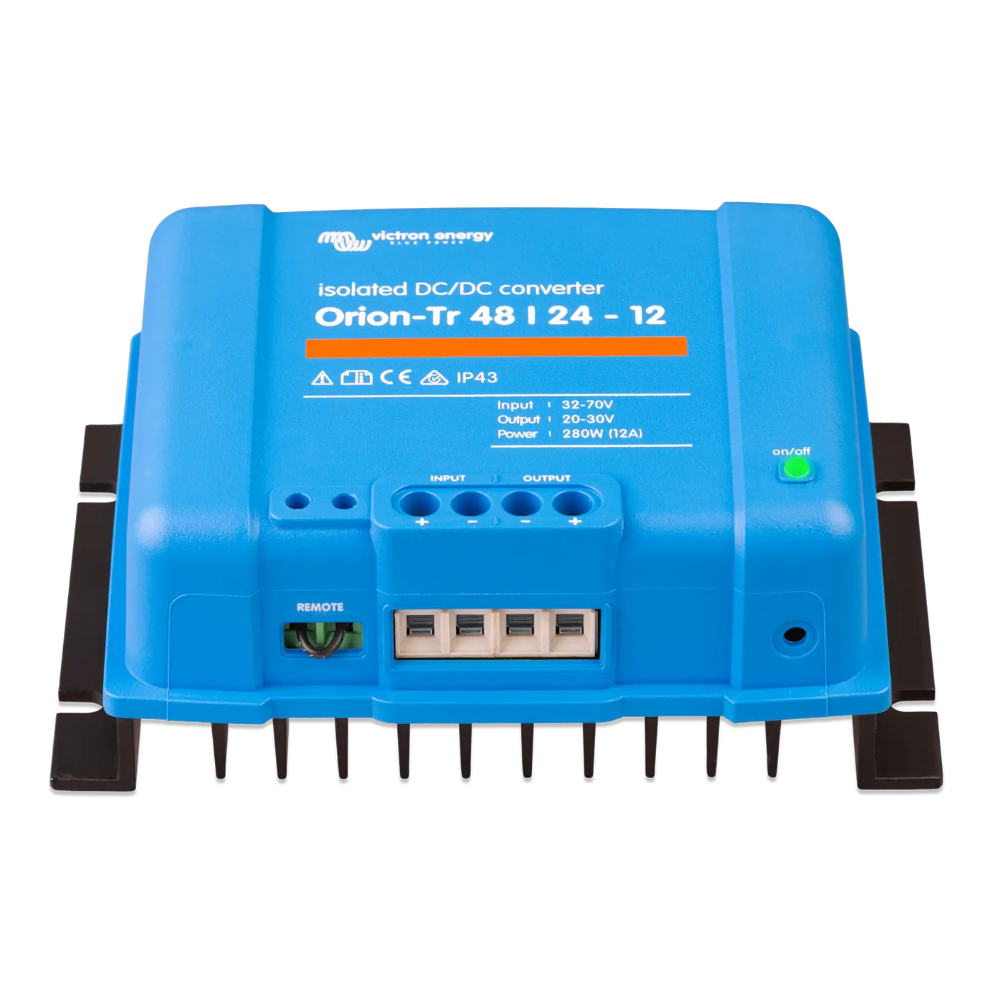 Victron Orion-Tr Isolated Converters are designed for large 12V/24V/48V battery systems. These models are short circuit-proof and come with a remote on/off feature that reduces wiring requirements and can be operated with simple control systems. An unlimited number of units can be connected in parallel for increased output current.