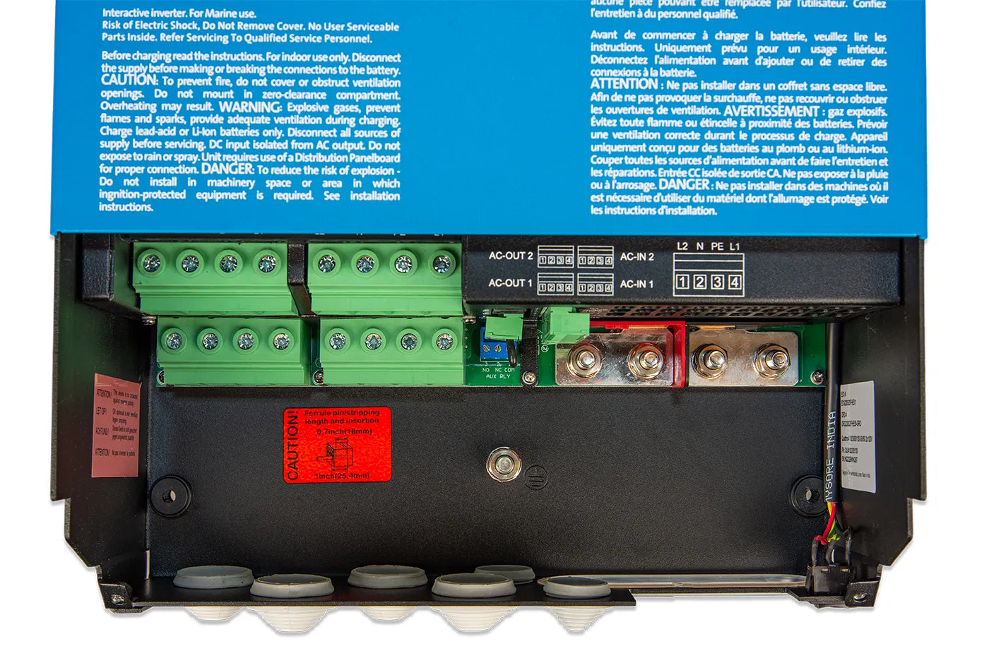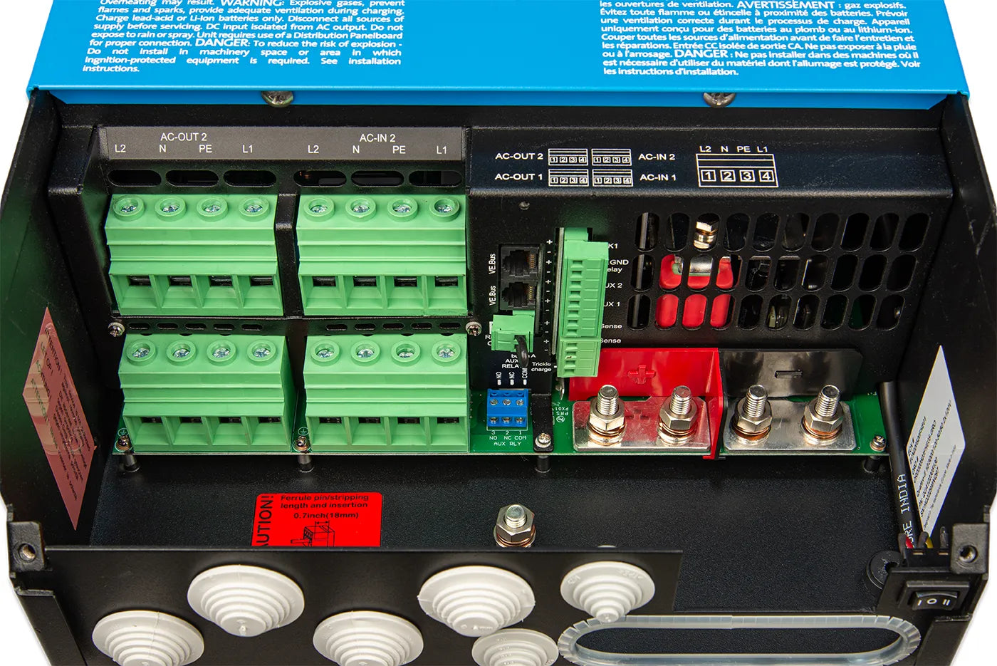 Similar to the MultiPlus-II 2x120V model, the Quattro-II 2x120V is a specialized inverter and charger designed for standard North American 50A 120/240VAC split-phase applications. It has the capability to accommodate two AC inputs and will automatically connect to the active source.